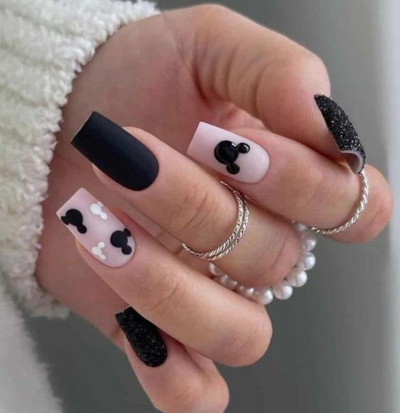 Black and pale pink nails featuring Mickey Mouse-inspired silhouettes bring out the playful side of nail art. The coffin shape provides a sleek canvas for this quirky style, while glittery accents on alternating nails add a touch of glam. This design is perfect for Disney fans or anyone attending a cute or Y2K-themed event.