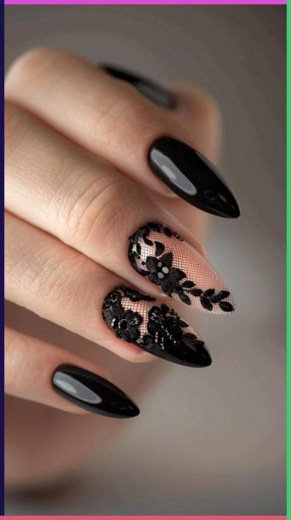 Start with nude gel nails and use a stamping tool or freehand technique to create the lace effect with black polish. Add delicate floral accents for depth. Maintain the natural nails look by using a transparent top coat for a smooth finish.