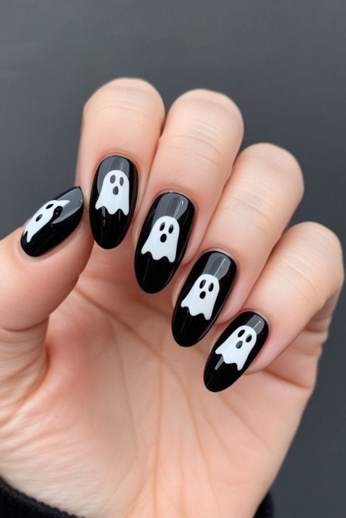 Black nails featuring cute ghost motifs are a playful take on seasonal nail art. The medium round shape makes this style functional yet chic, perfect for spooky season gatherings or casual fun.