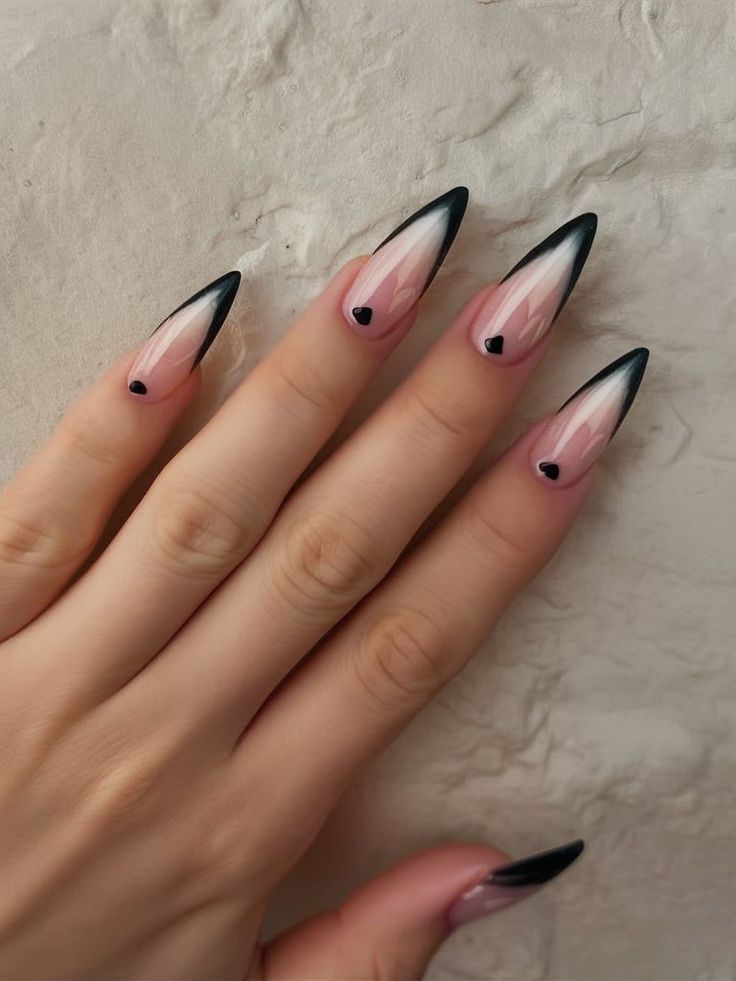 This design elevates the classic French manicure by replacing white tips with sleek black. The almond nail shape adds a refined touch, while the minimal black heart accent creates a cute and romantic aesthetic. This is a great option for natural nails or subtle elegance.
