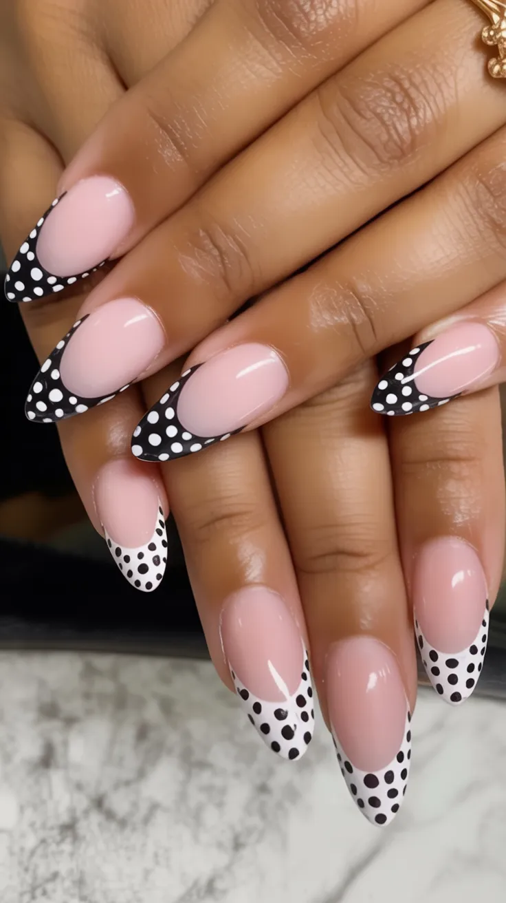 Soft Pink and a bold Black and White polka tip? Yes, please. This almond shape feels feminine and flattering, while the dotted French detail adds a retro twist that’s completely Trendy right now. It’s playful but still grown-up—the sweet spot we’re all chasing.