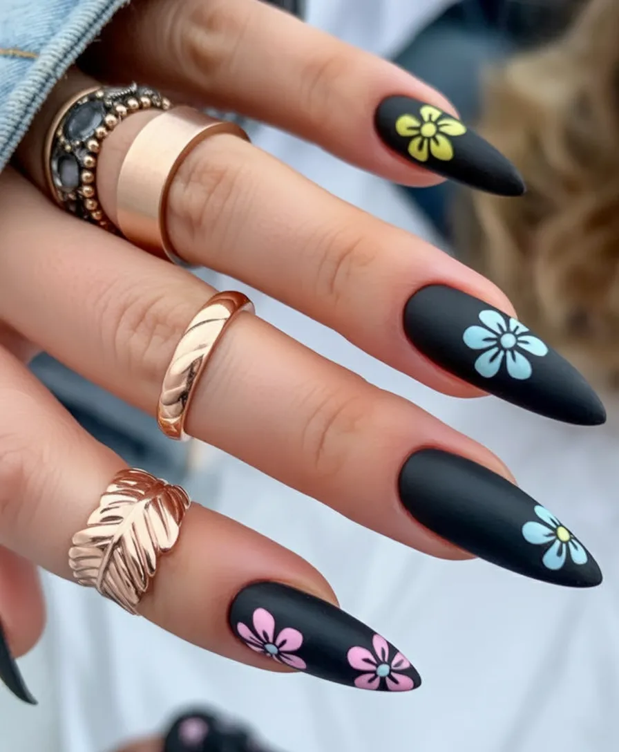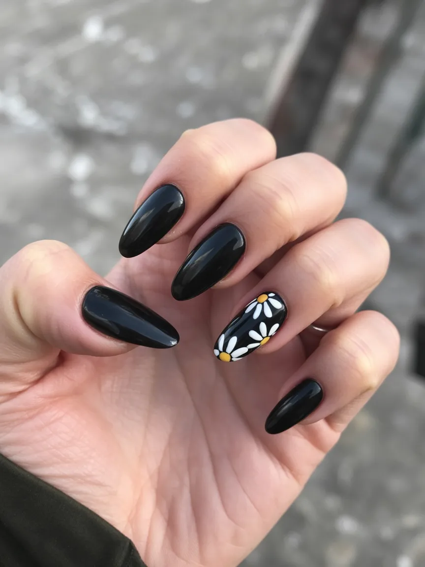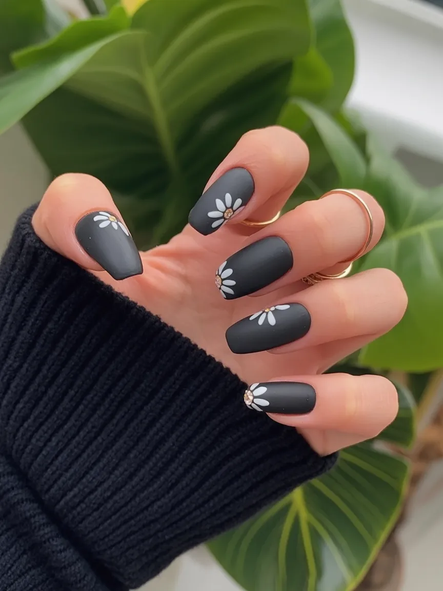 There’s something so comforting about short black nails in spring—especially when you add a little daisy detail. The Matte texture makes the black feel soft instead of heavy, and those simple flowers bring that seasonal freshness we all crave after winter.