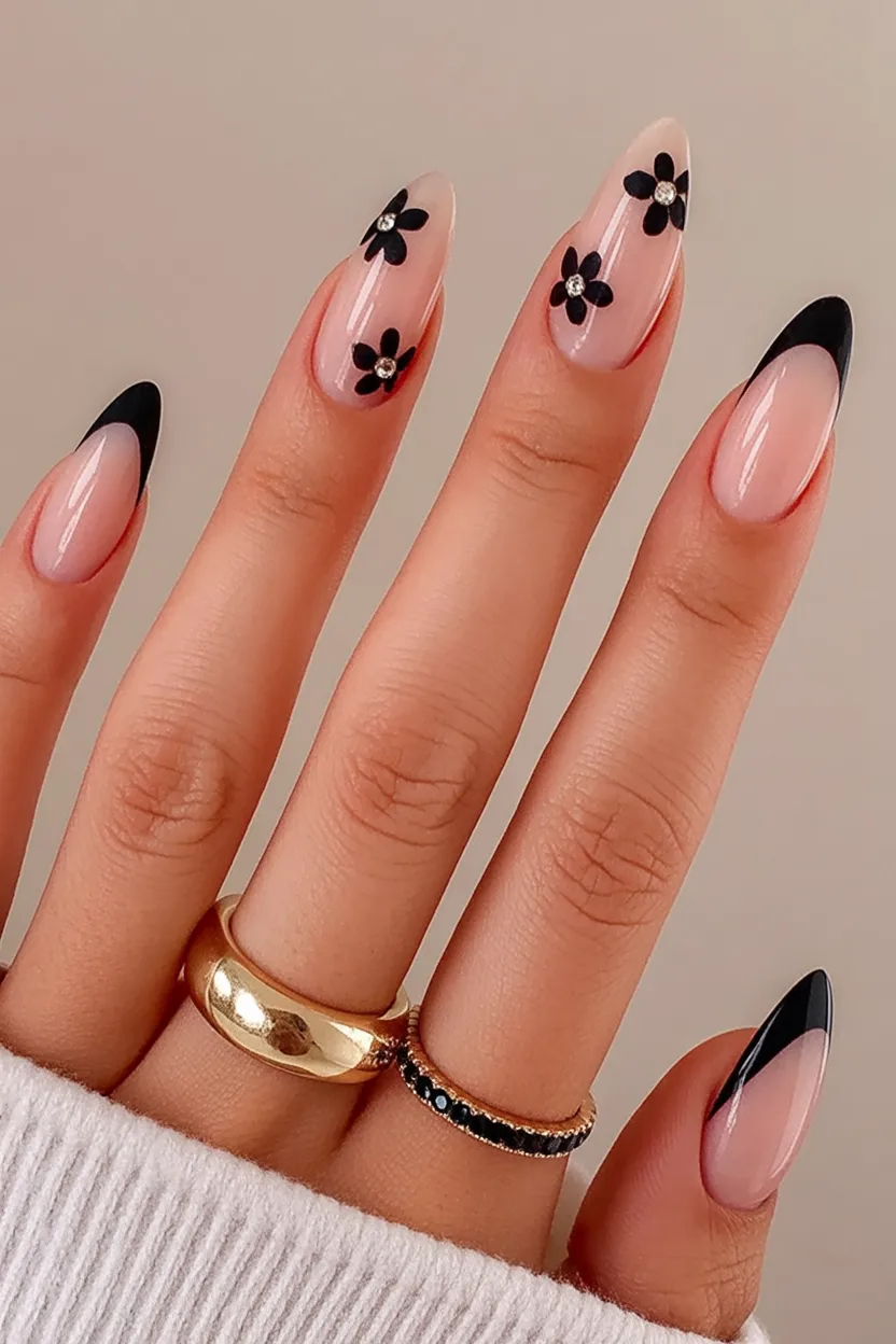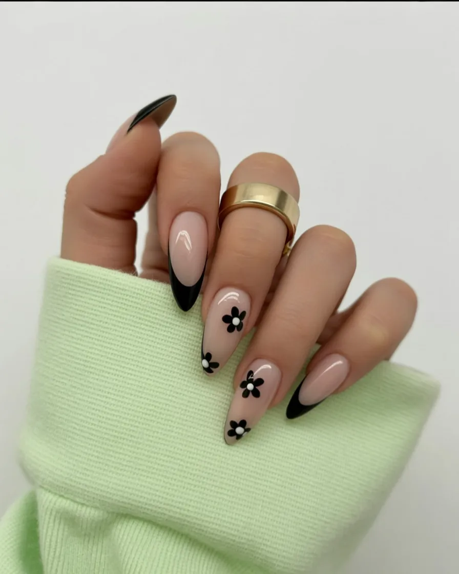 7. French Almond with Black Tips and Floral Details