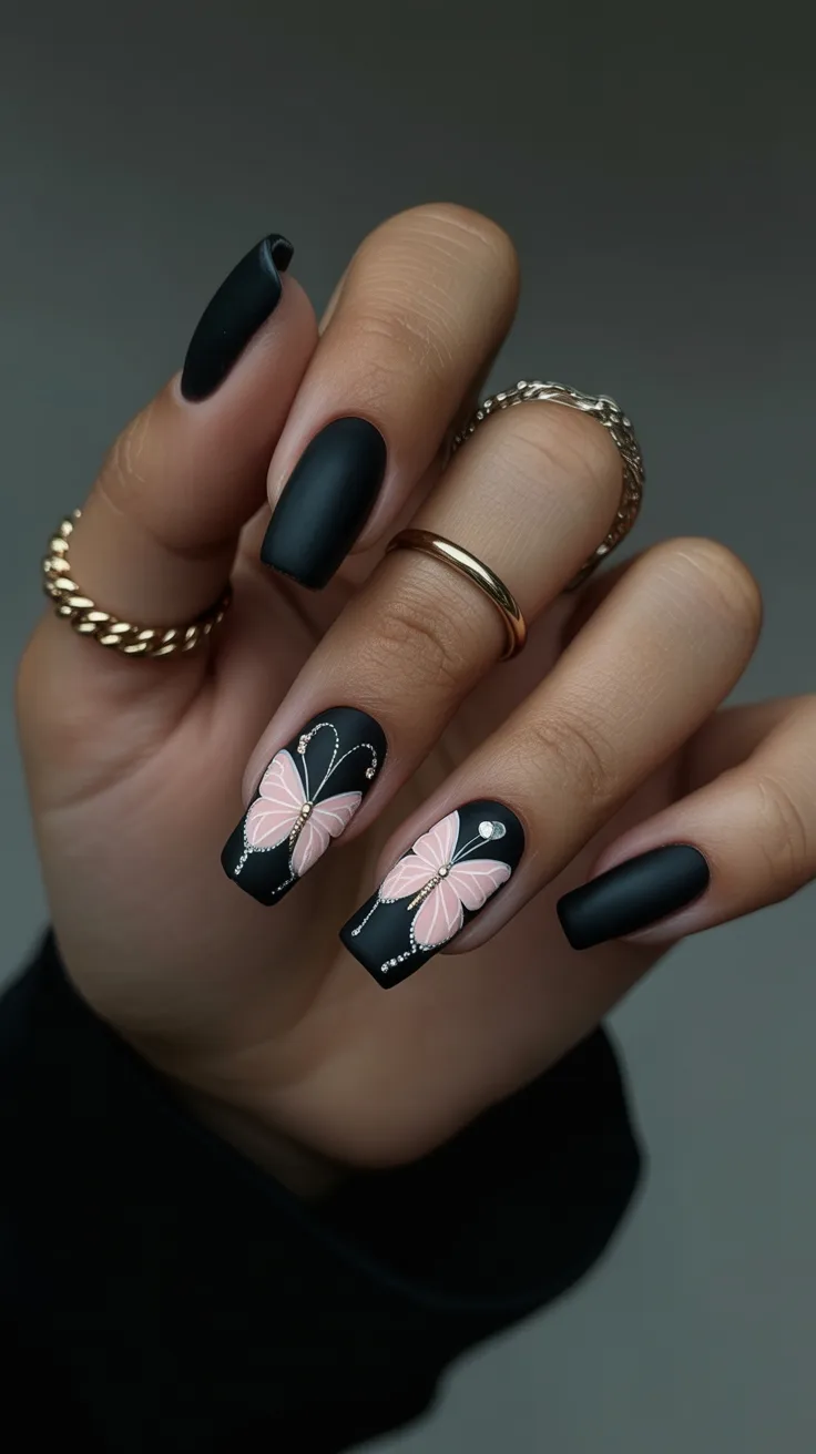 Now this one feels magical. Matte black nails paired with a soft pink Butterfly designs bring that transformation energy we all love in spring. It’s bold, yes, but there’s something hopeful and light about it too—like you’re stepping into a new chapter.