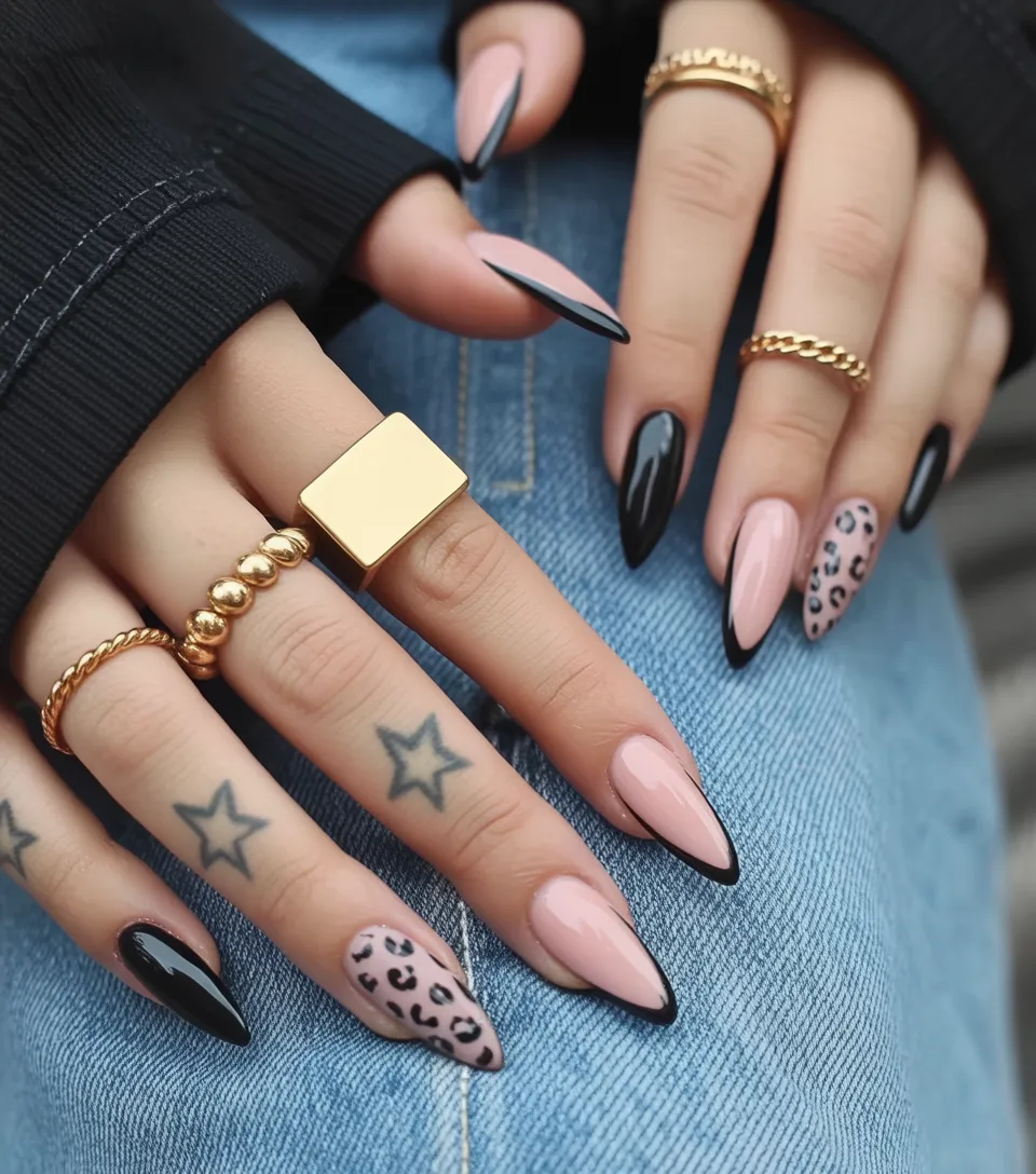 Now this one has attitude. The Long almond shape instantly feels bold, and that sharp black French tip against soft Pink and nude tones is pure drama in the best way. Add a hint of leopard detail, and suddenly you’ve got a manicure that says you’re not afraid to stand out. It’s edgy, Trendy, and still completely wearable.