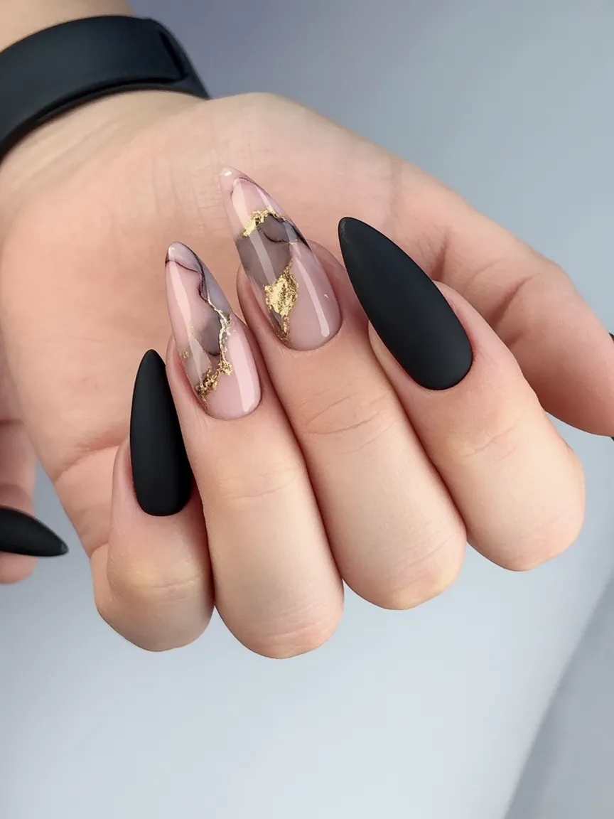 There’s something undeniably luxurious about black paired with nude and a touch of gold. The almond shape keeps everything elegant, while the marbled accent with gold detailing adds that subtle wow factor. It’s refined, sophisticated, and feels very 2026.