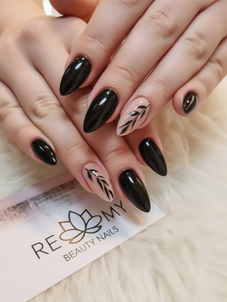 There’s something about Matte black that feels almost luxurious. Add a single delicate leaf design over a nude accent nail, and suddenly the whole manicure feels thoughtful and artistic. It’s understated, but in that confident way that doesn’t need to shout.
