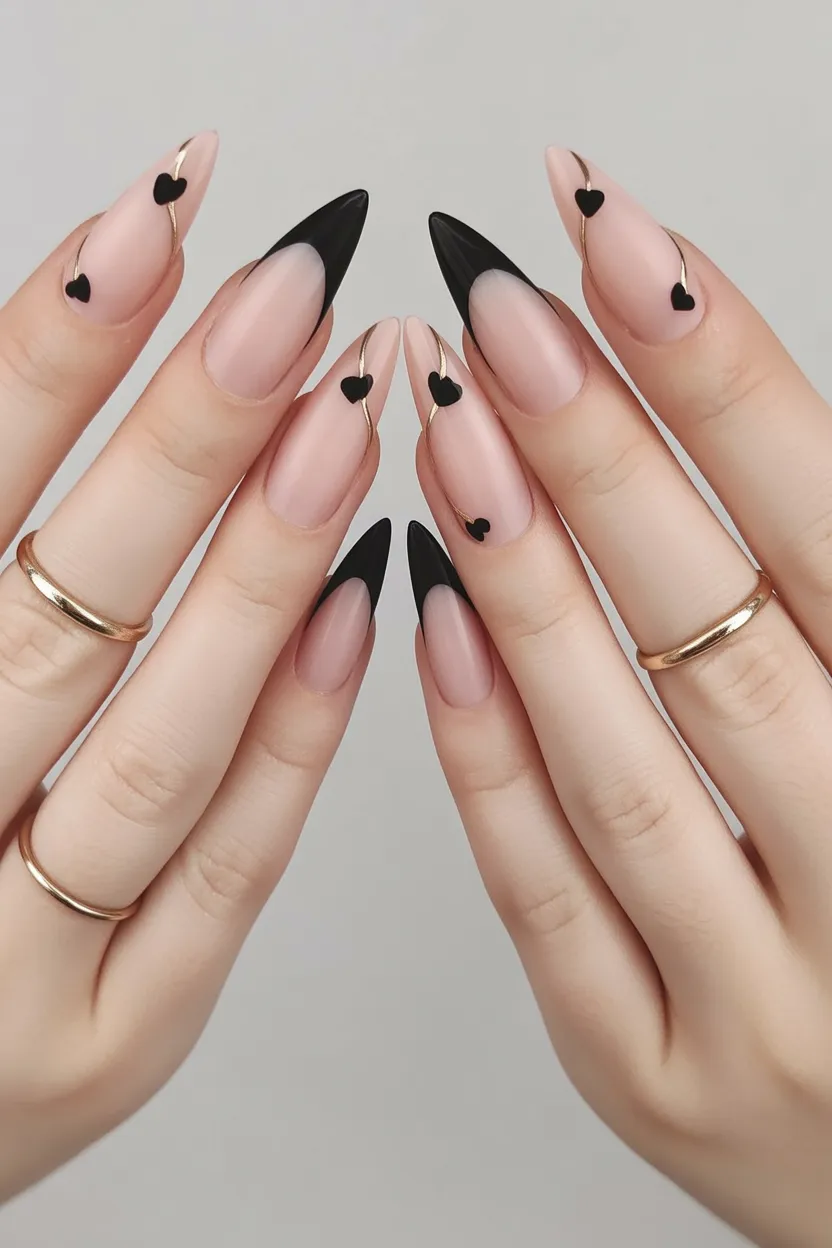 Okay, tell me this isn’t the chicest way to wear hearts as an adult. The almond base in soft nude paired with sharp black French tips feels sleek and grown-up, but those tiny black hearts with delicate gold curves? That’s where the magic happens. It’s romantic without being sugary and playful without losing sophistication. This is black spring nails 2026 energy at its finest—a little love, a lot of polish.