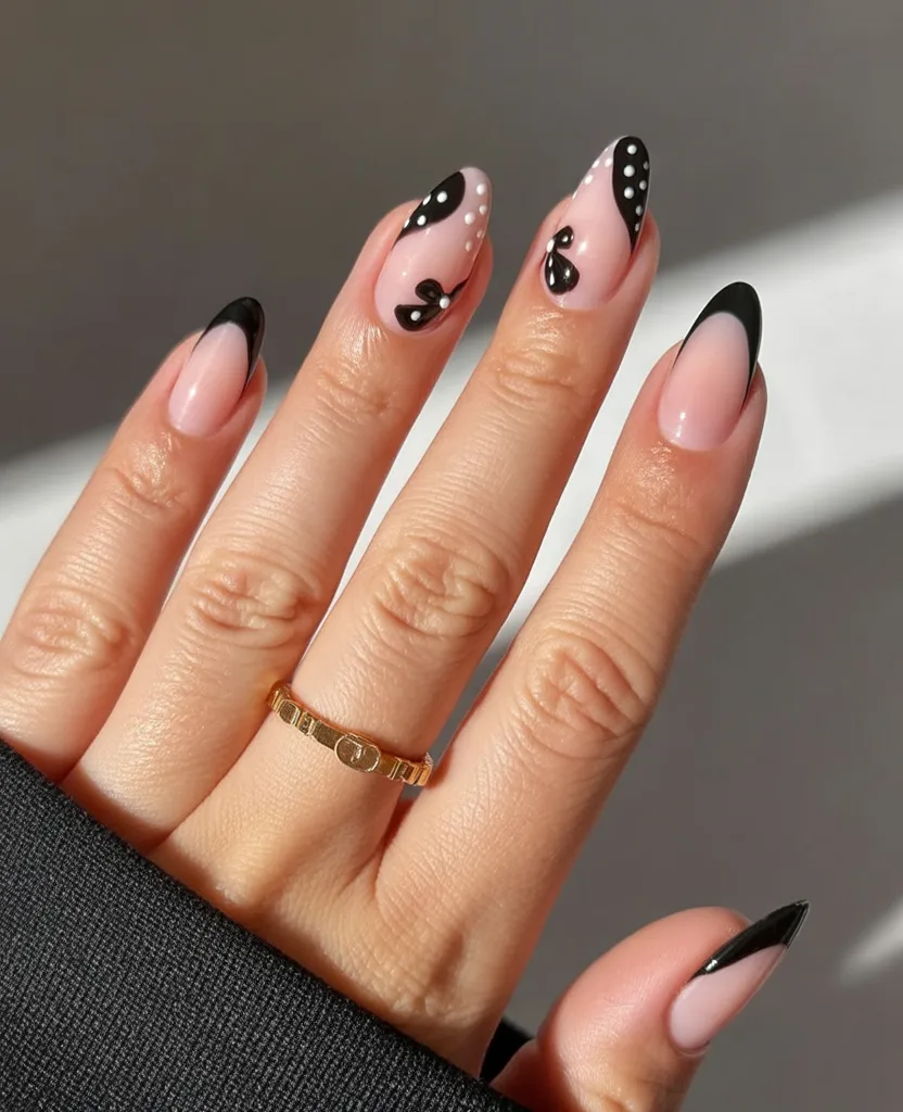This design feels like spring with a little Parisian charm. The almond base in nude with black French tips is timeless, but those tiny bow accents? Absolutely irresistible. They add just enough. Cute detail without tipping into overly girly territory.