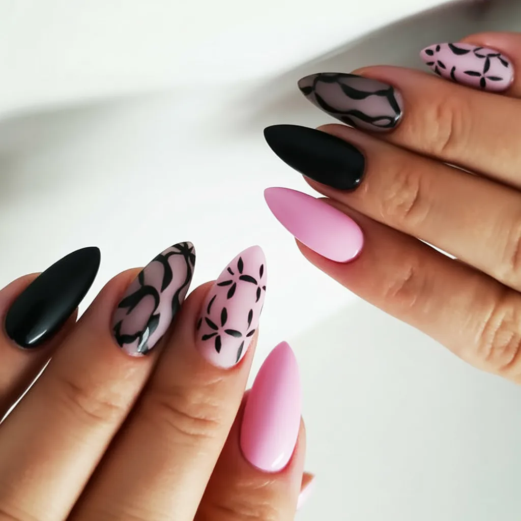 Soft Pink and bold black—honestly, this combo never disappoints. The almond shape keeps everything feminine and fluid, while the floral Art details create movement across the nails. It feels romantic but modern, like spring with a little mystery layered in.