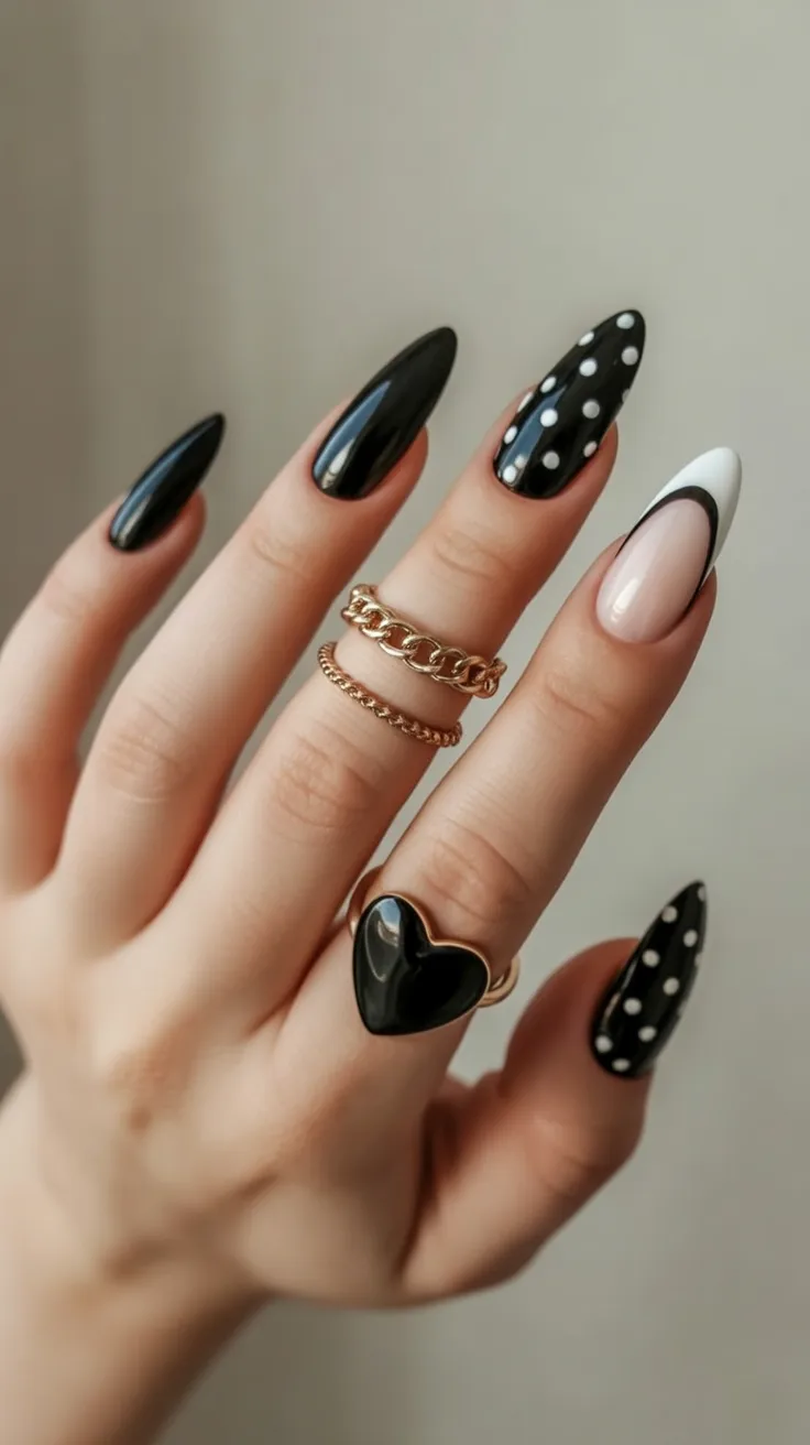 This set is pure personality. Long almond nails in glossy black, mixed with Black and White polka dots and graphic French accents, feel playful but still polished. It gives off that cool-girl vibe—the one who pairs sneakers with a blazer and somehow makes it look effortless.