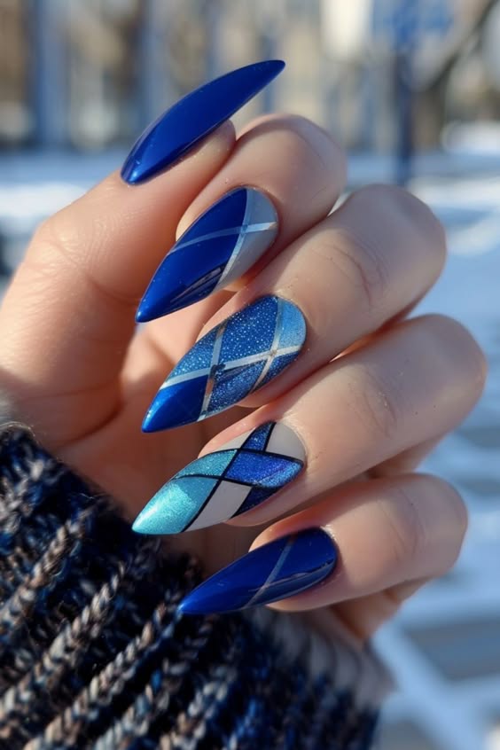This stunning geometric nail design combines various shades of blue with silver accents for a chic, modern look. Perfect for adding sophistication to any winter outfit, the sharp lines and bold shapes make this a standout manicure.