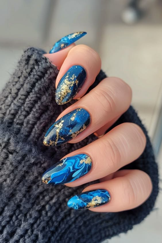 This luxurious navy blue nail design features stunning gold marbling for an elegant, celestial vibe. The metallic accents add a touch of glamour, while the deep blue base creates a striking contrast that is perfect for a night out.
