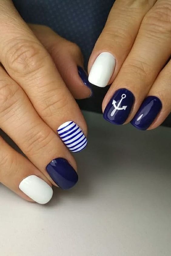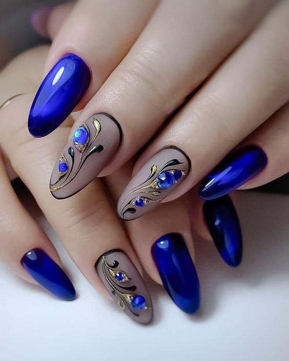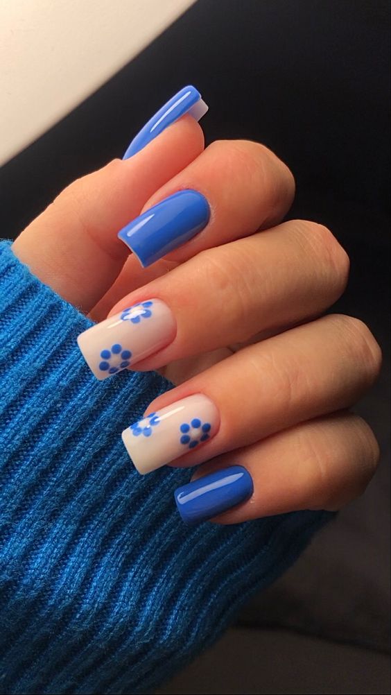 Moving on, let’s shake things up with blue nails with design. Think geometric patterns, subtle stripes, or even floral motifs. This idea is perfect for those who love a bit of drama on their fingertips.