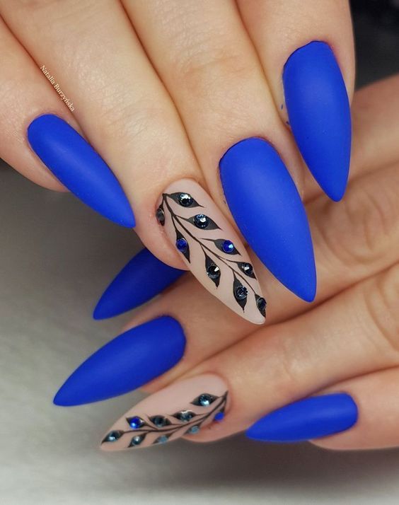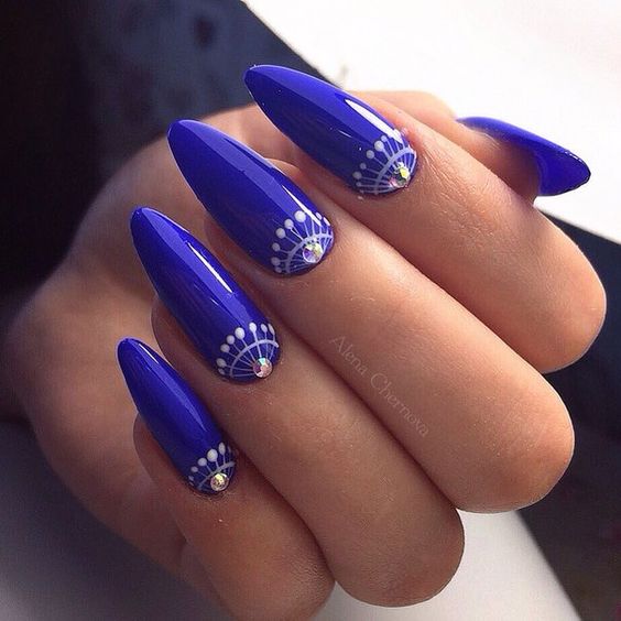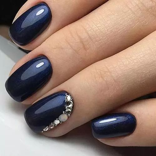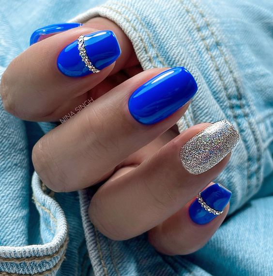 The add some sparkle with Rhinestones on your blue nails. It’s a way to turn heads and add a touch of glamour to your everyday look.