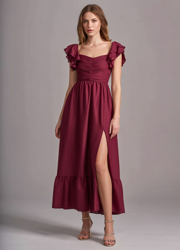 This burgundy dress is the definition of quiet drama. The fluttery ruffle sleeves frame the shoulders, the bodice is softly ruched through the center, and the tiered hem swishes around the ankles with every step. The side slit keeps it from feeling too sweet, giving just a peek of leg as you move. It’s the kind of piece that makes you stand a little taller the second you zip it up—elegant, feminine, and just a touch mysterious.