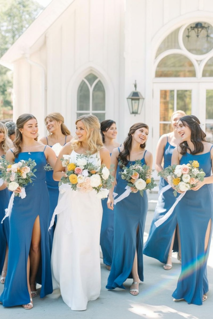 There’s something timeless about a row of bridesmaids in navy blue, and this version feels like the latest upgrade. The clean, straight silhouettes skim the body, while the side slits flash just enough leg to keep things fun and modern. Walking together, the dresses move like ripples of ocean color around the bride, creating a fresh, coastal-chic moment that works just as well for a church wedding as it does for an outdoor ceremony.