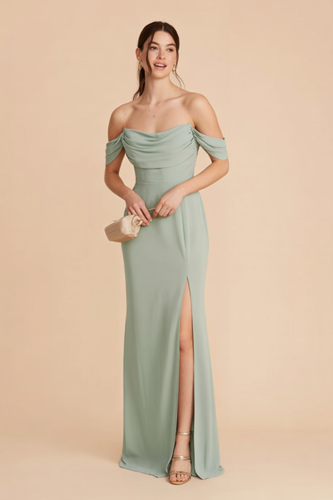 19. Soft Sage Green Off-Shoulder Chiffon for Breezy Romance