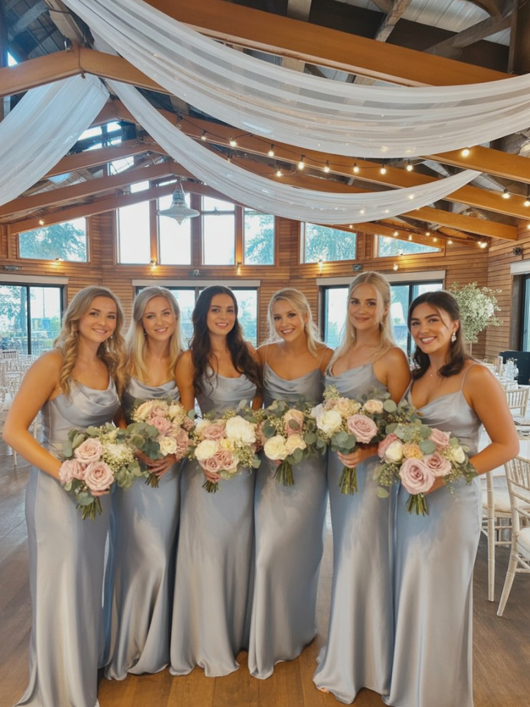 Despite looking high-fashion, this kind of satin column is wonderfully low-maintenance for busy wedding weekends. The slip-style cut requires minimal tailoring, and the fabric resists creasing more than you’d expect—ideal if everyone is traveling. A quick steam in the hotel bathroom and a swipe of body lotion on shoulders and collarbones is usually all it takes. Because the silhouette is so simple, each woman can personalize it with her own earrings, hairstyles, and shoes, which makes these Dusty Blue bridesmaid dresses 2026 a stress-free win for both bride and bridal party.