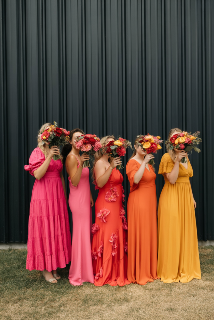 If your dream is a Wedding that feels like a festival, this sunset-bright line-up will make your heart skip. Hot pink, coral, fiery orange and marigold Yellow dresses stand shoulder to shoulder, each one different yet perfectly in tune with the others. The bouquets echo the same punchy tones, so the whole group looks like a moving bouquet of color—joyful, loud in the best way, and impossible to forget.