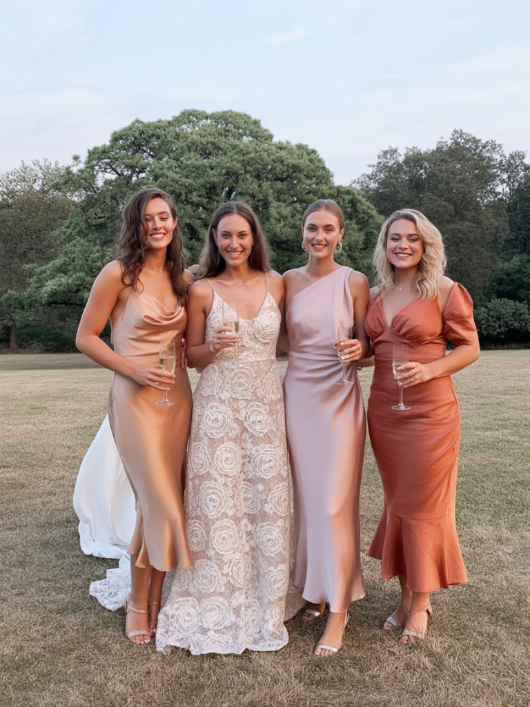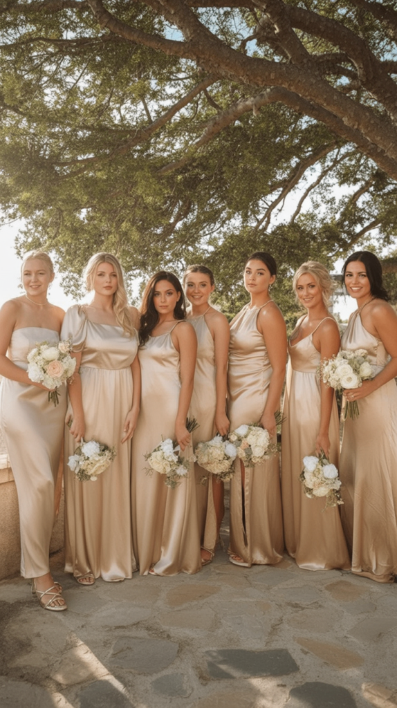 This palette is a dream if your bridal party spans different skin tones and body types. Champagne satin acts almost like a highlighter on deeper complexions and a soft bronzer on fair skin, so nobody looks washed out. For bridesmaid dresses in 2026, it’s ideal when you want one cohesive family of styles but still let each woman choose the neckline that works for her. Strapless, halter, scoop—keep the fabric and color consistent and let the cuts flex, and you’ll have a group shot that feels perfectly tailored to your real-life friends.