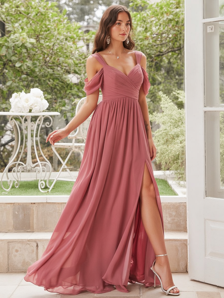 This mauve chiffon gown feels like something out of a garden romance novel—in the best, most wearable way. The off-shoulder draped straps show just enough skin while still feeling secure, and the soft pleating through the bodice gently defines the waist. When the skirt catches the breeze, it swirls around the legs, and that front slit adds a hint of drama without shouting for attention. It’s dreamy, feminine, and perfect for a floral-filled wedding day.