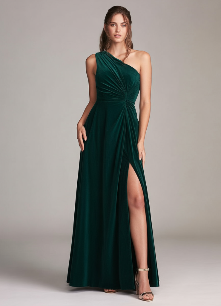 This dark green velvet gown is pure drama—in the most elegant, wearable way. The one-shoulder neckline shows off the collarbone, while the gathered waist and cascading drape create beautiful curves through the midsection. The thigh-high slit keeps the velvet from feeling heavy, flashing just enough leg as you walk or spin on the dance floor. It’s the sort of dress that makes you feel like you belong in a candlelit historic mansion, even if you’re just heading to the reception bar.