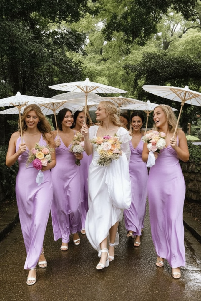 Even a rainy forecast feels charming when your bridesmaids are gliding along in lavender slips. These bias-cut gowns skim the body without squeezing, and the soft purple shade lights up against umbrellas and wet stone paths. There’s a sense of easy, real-life joy in the way they move—nothing stiff or overthought, just friends laughing their way through whatever the weather throws at your wedding day.