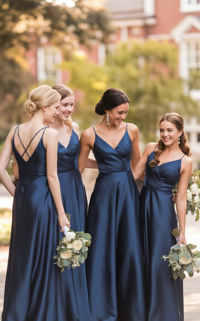 These navy blue gowns are the definition of polished: clean V-neck bodices, softly flared skirts, and just enough sheen in the satin to catch the evening light. When your bridesmaids stand together, the effect is almost symphonic—rich color, graceful lines, and a quiet confidence that lets the bride’s gown shine. It feels formal without being stuffy, ideal for church ceremonies, hotel ballrooms, or any wedding where you picture candlelit portraits and champagne toasts.