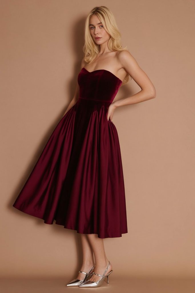 17. Vintage-Inspired Burgundy Velvet Tea-Length Dress
