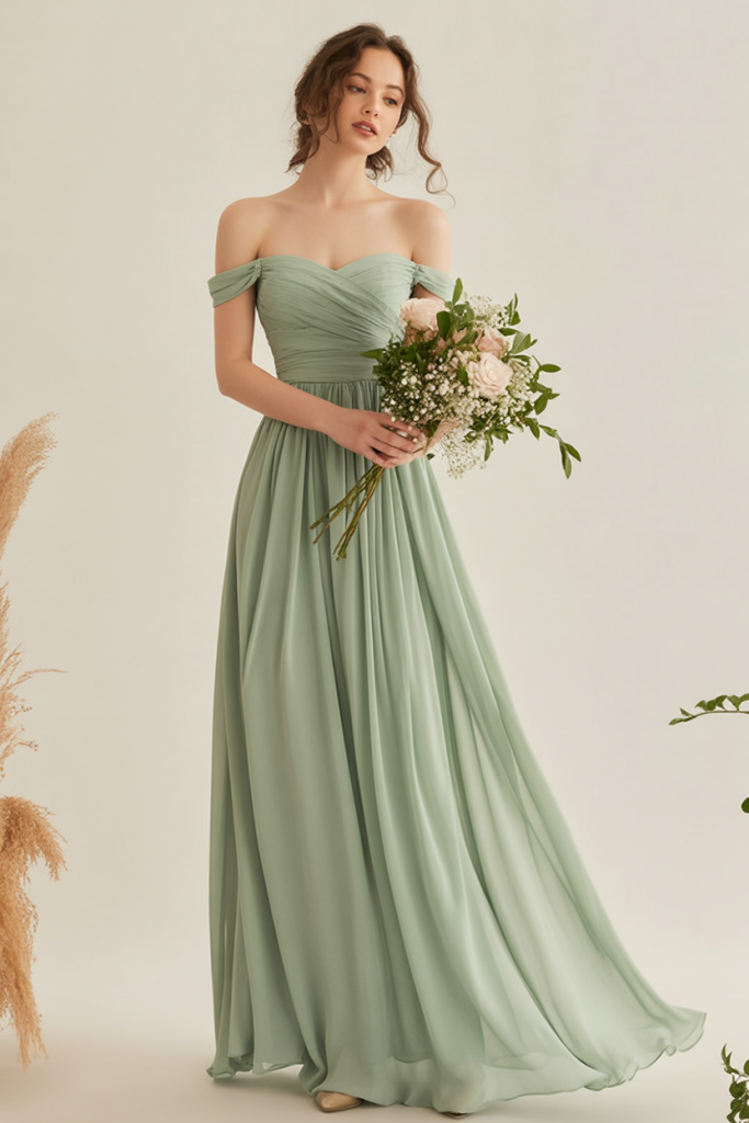 This sage green chiffon gown is like a deep breath in dress form. The off-shoulder neckline skims the collarbones, the ruched bodice defines the waist without squeezing, and the skirt falls in lazy, graceful folds that move with every step. The color feels grounded yet soft, the perfect middle ground between earthy olive green and airy pastel tones—especially lovely for outdoor ceremonies surrounded by grasses and soft floral arrangements.