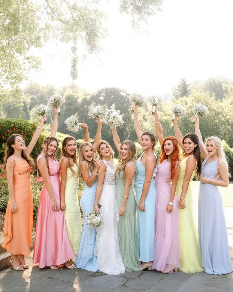 1. Pastel Rainbow Bridesmaids for a Joyful 2026 Wedding