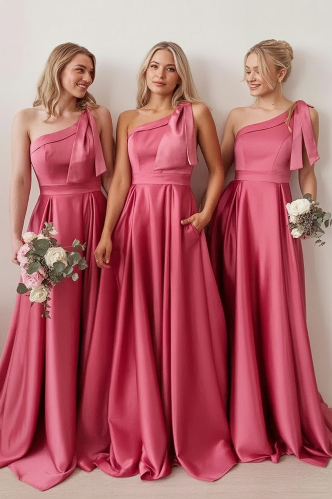 These bold pink satin gowns are for the brides who want their wedding to feel like a celebration from the first step down the aisle. The one-shoulder neckline and dramatic full skirts give serious red-carpet energy, while the sheen of the satin catches every bit of light in the room. Standing next to the bride, the dresses read as joyful and confident, like your closest friends are wrapped in pure party mood.