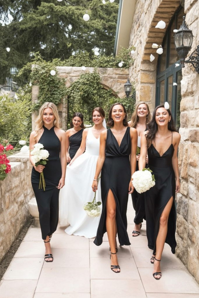 There’s a reason black never left the style conversation—it just moved into the wedding party. This group of sleek black gowns proves how sophisticated the look can be: slinky skirts, subtle slits, and a mix of necklines that feel modern but still timeless. Walking through a stone courtyard or down a city street, the bridesmaids look like they’re heading to the chicest event in town, with the bride in white shining even brighter in the middle.