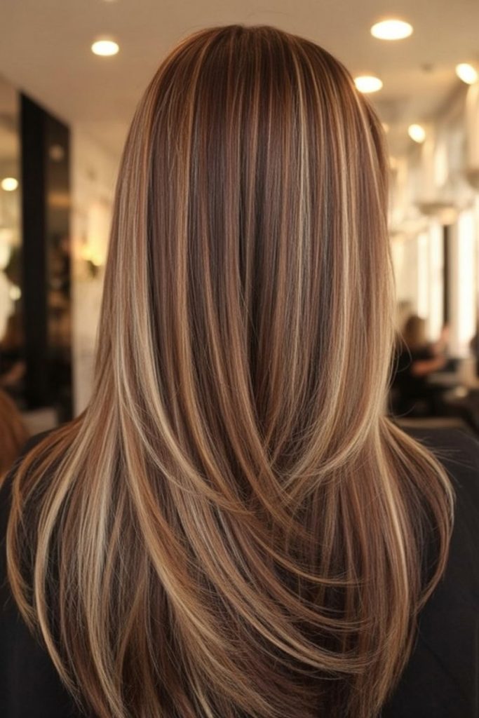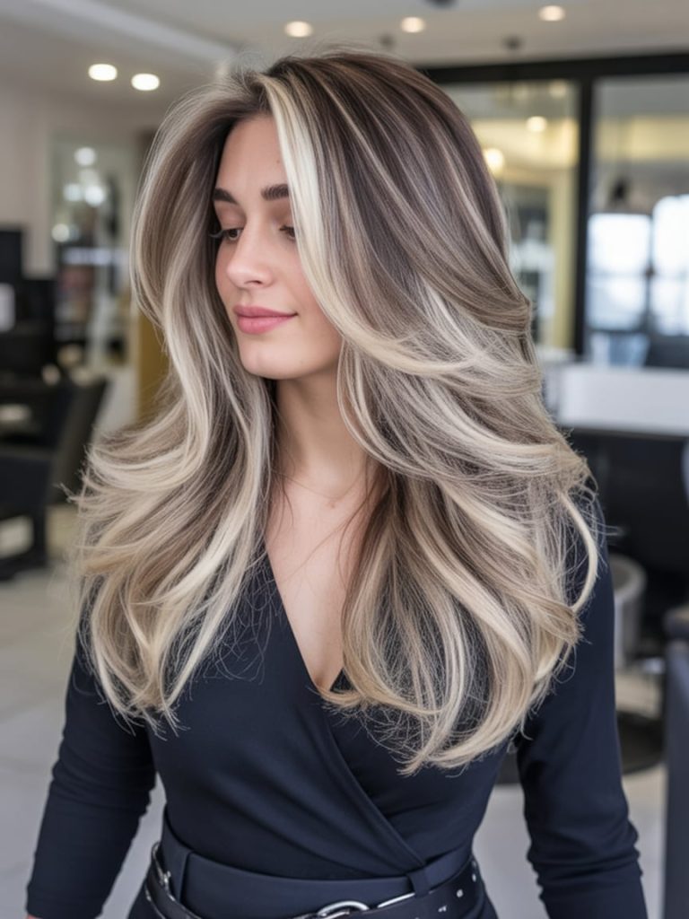 This look is pure “soft glam,” but in a very grown-up way. The long layers give that bouncy, airy movement, and the light blonde tones are blended so beautifully that the brunette base still feels present. It’s bright, but not screaming—more like a gentle spotlight that follows you around. And the overall finish? Smooth, plush, and seriously luxe.
