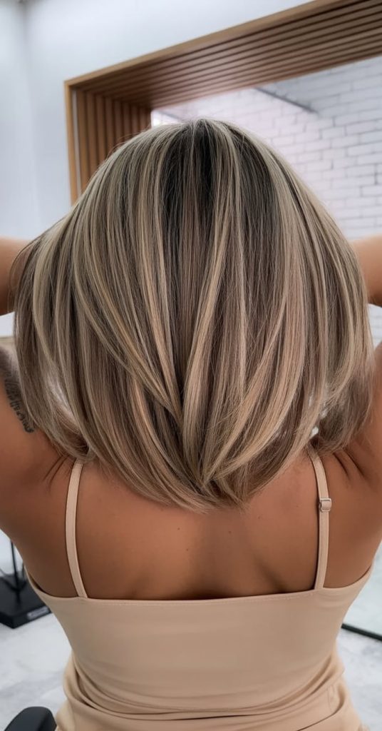 What makes this cut special is how it creates shape without needing a ton of styling time. The subtle lowlights keep the base looking full, while the lighter pieces add movement so the bob doesn’t read flat. If your hair is fine or naturally straight, this is especially flattering—ask your stylist to keep the ends slightly beveled under and place the lighter tones more on the surface for that soft, dimensional sheen.