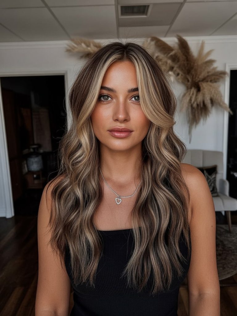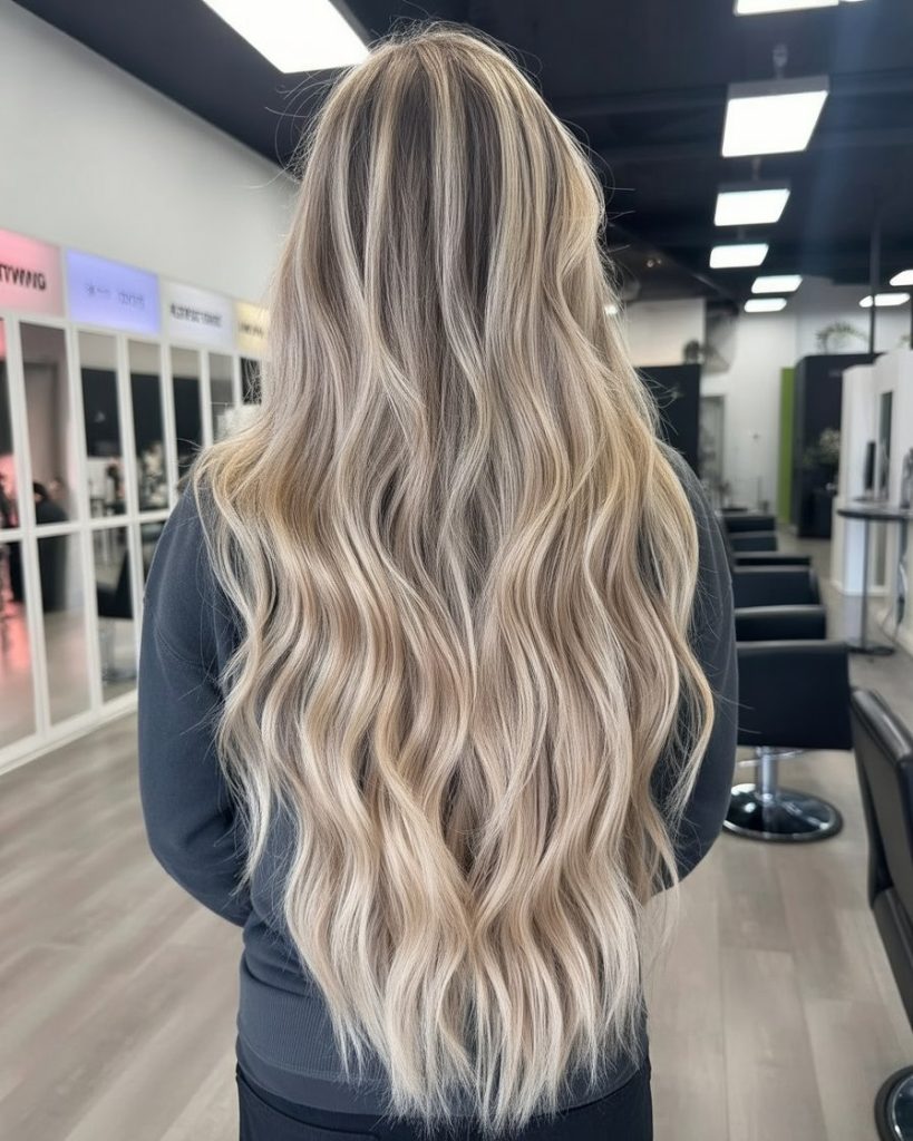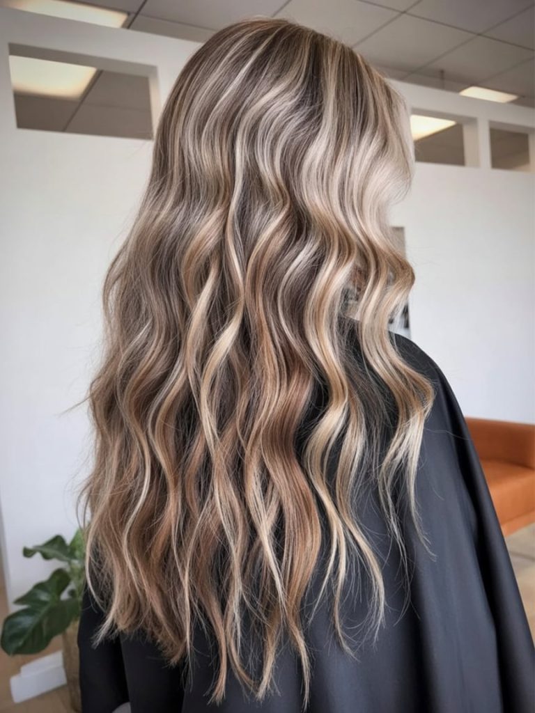 If you’ve ever wanted “wow hair” that still feels soft and wearable, this is it. The length is dreamy, the wave pattern is relaxed, and the light ribbon highlights are blended so smoothly they look like they belong there. It’s a cool-toned take on brunette-to-blonde that feels clean, expensive, and very 2026—like your hair is your best accessory.