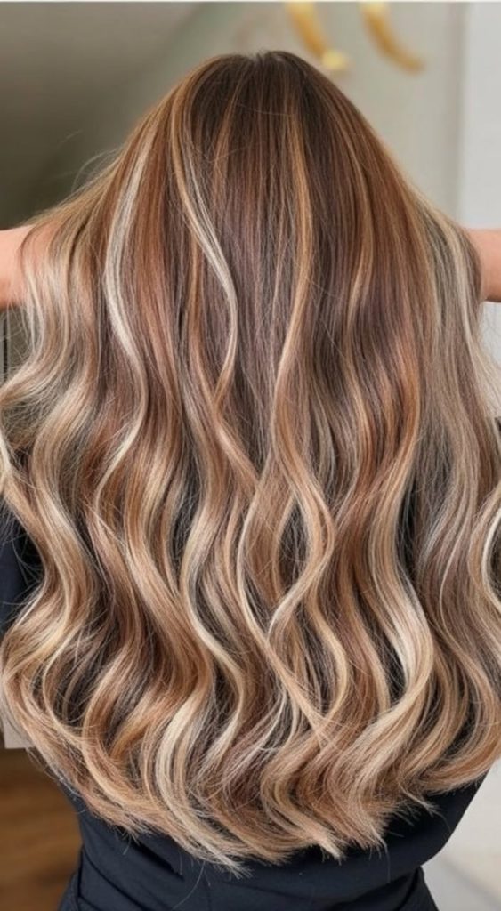 This is that perfectly balanced brunette-highlight look: not too dark, not too bright, just deliciously dimensional. The brown balayage base gives depth, while caramel blonde ribbons swirl through the waves like they were painted on. It feels warm, flattering, and effortless—like your hair naturally catches the sun even when you’re just running errands.