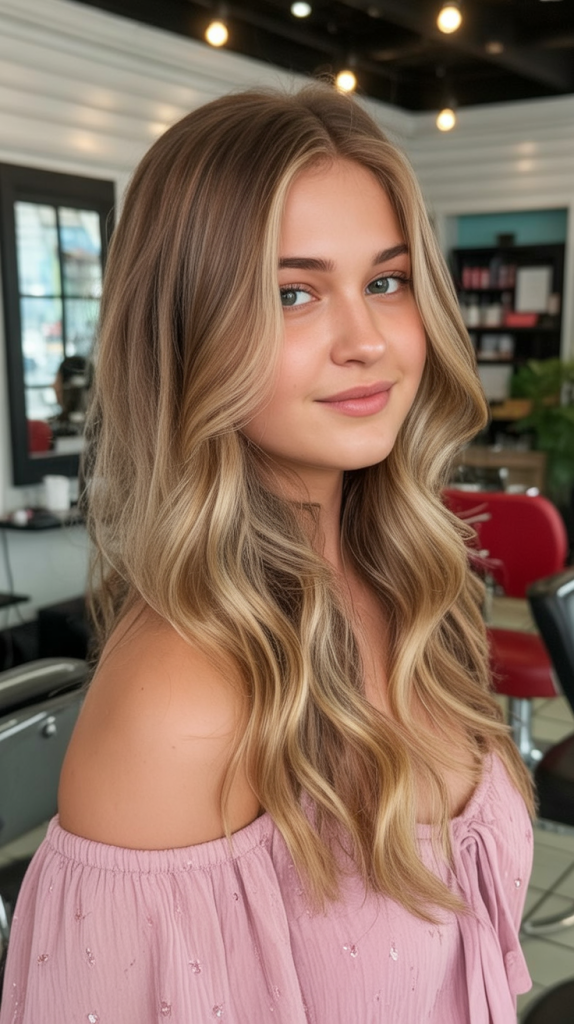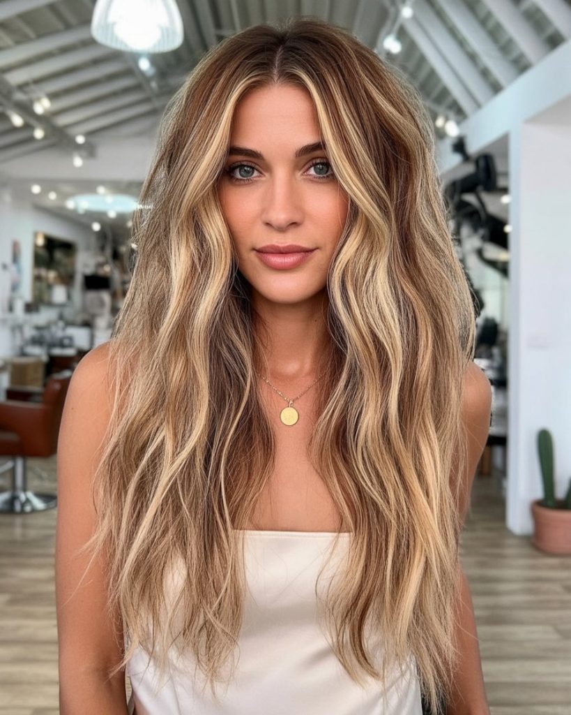 If you’ve got medium to thick hair (or fine hair with a lot of density), this style is a dream. The face-framing sections keep the front looking fresh between appointments, and the lived-in blonde-brunette blend grows out gracefully. Ask for brown balayage through the lengths so the highlights melt instead of stripe. Style with a large barrel iron or a blowout brush, then rake through with a little texture cream so the waves stay airy, not crunchy.