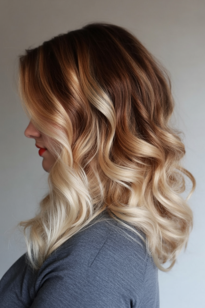 To keep this looking expensive, the styling matters: smooth blow-dry first, then add loose waves with a 1.25″ iron so the color melt shows in motion. Use heat protectant every time (blonde ends need it), and finish with a lightweight glossing oil just from midshaft down. If you’re worried about brassiness, a toning mask once a week helps keep the blonde creamy while the copper stays rich instead of orange.