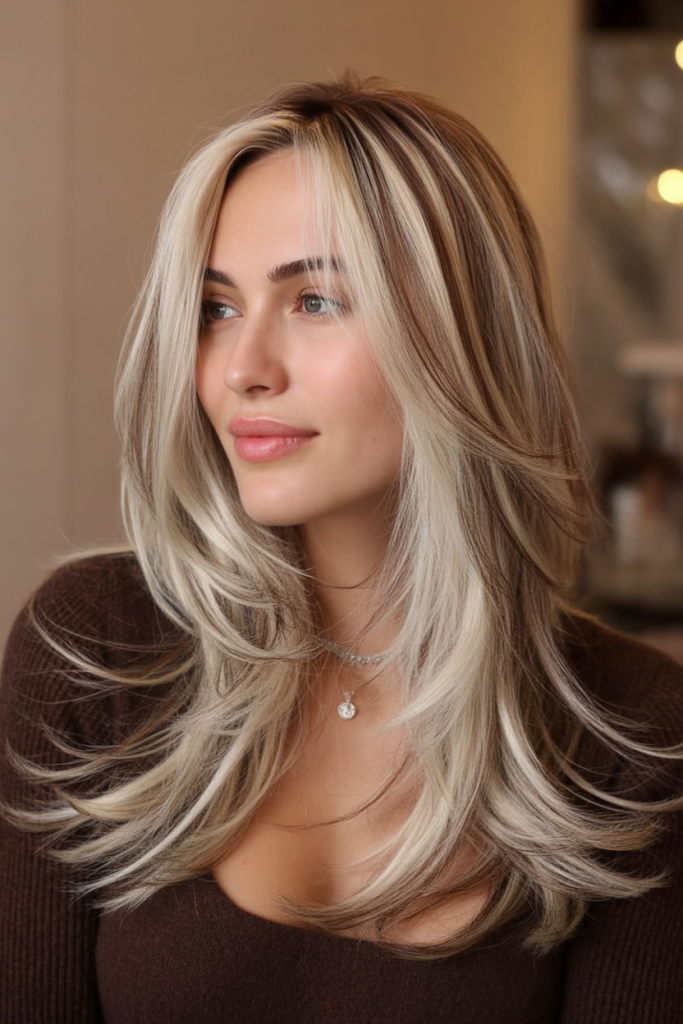 Compared to a full blonde transformation, this gives you that bright, face-opening effect while keeping a brunette base for depth and easier upkeep. The key is keeping dimension: ask for lowlights through the interior so the blonde doesn’t swallow the shape of the layers. Style with a round brush or hot brush, flipping the ends away from the face-framing sections. A little volumizing mousse at the roots gives that salon lift that lasts all day.