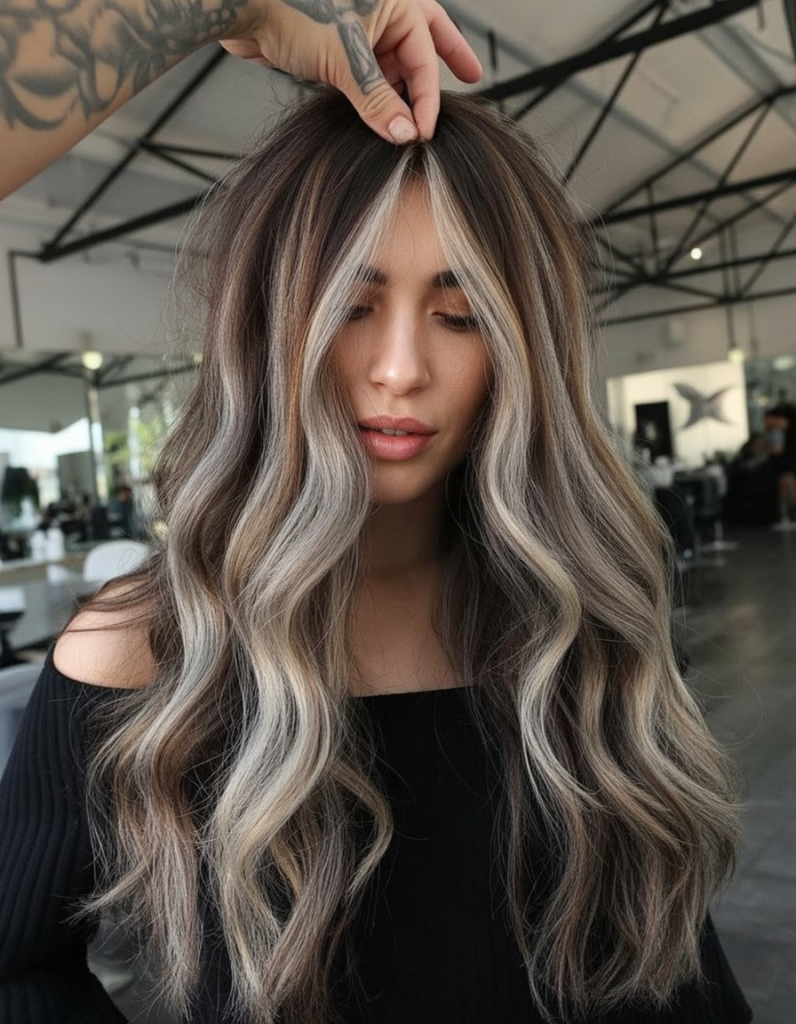 This color has that cool, editorial feel—like you stepped out of a nice salon and into a very flattering filter. The waves are loose and modern, and the ashy blonde pieces are placed in a way that makes the brunette base look deeper and shinier. It’s dimensional, slightly moody, and totally chic without being harsh.