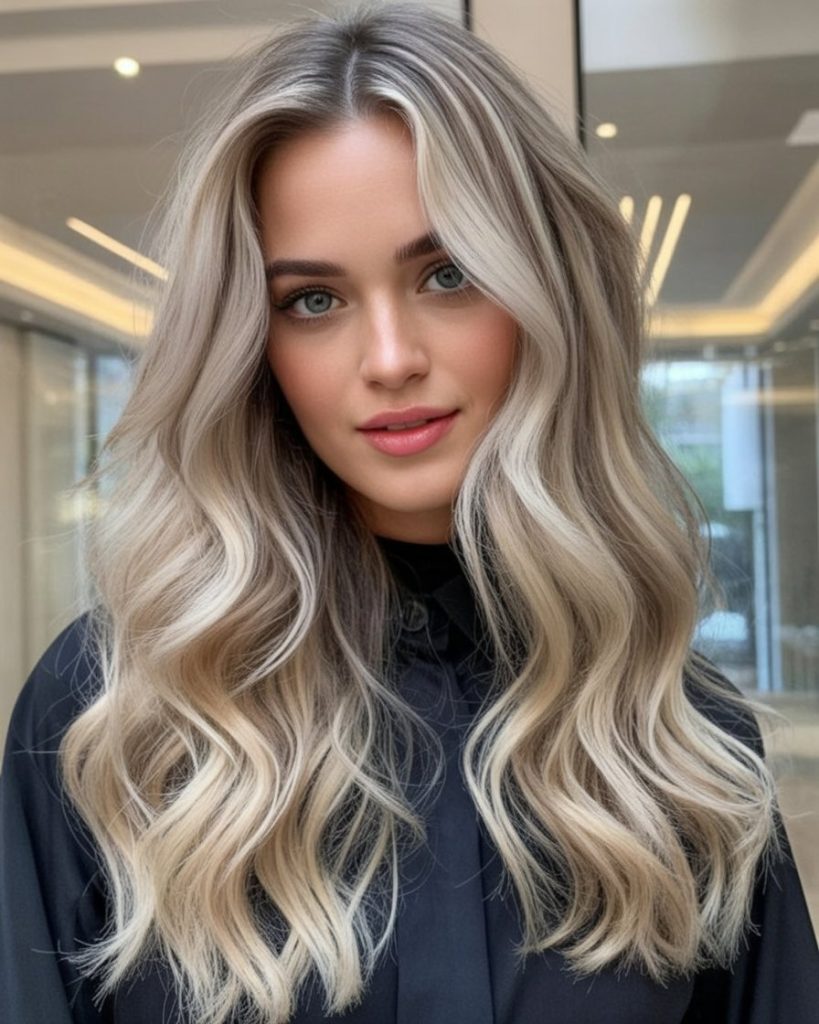 The vibe here is confident and a little edgy—perfect if you like clean outfits, bold brows, and that slightly undone wave. This works best on medium to long hair because you need space for the melt to blend. Ask your stylist for balayage with cooler toning and a gentle shadow root so the grow-out stays seamless. Style with a curling wand and leave the ends slightly straighter for that modern, relaxed finish.