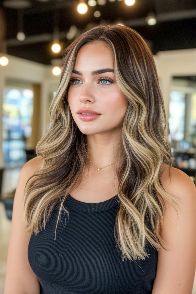 This is the kind of long, glam hair that still feels relaxed—like you just got back from a weekend away and somehow your hair decided to behave. The mix of dark brunette depth with light blonde brightening is so flattering, especially with those bronde money pieces that make your eyes and cheekbones look a little more “done” without trying. It’s soft, touchable, and quietly expensive-looking in the best way.