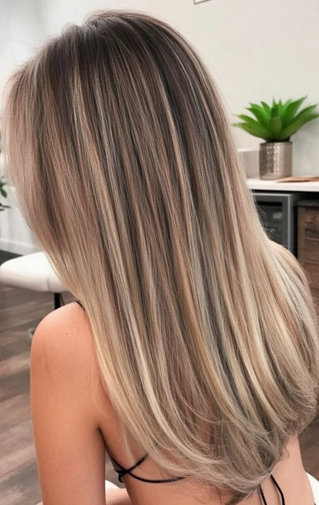 This is sleek, calm, and quietly powerful—the hair equivalent of walking into a room and not needing to announce yourself. The straight finish makes the blend look so clean: a deeper brunette at the top that melts into ashy blonde toward the ends. It’s cool-toned without feeling harsh, and the smooth movement gives it that “fresh from a gloss treatment” shine.