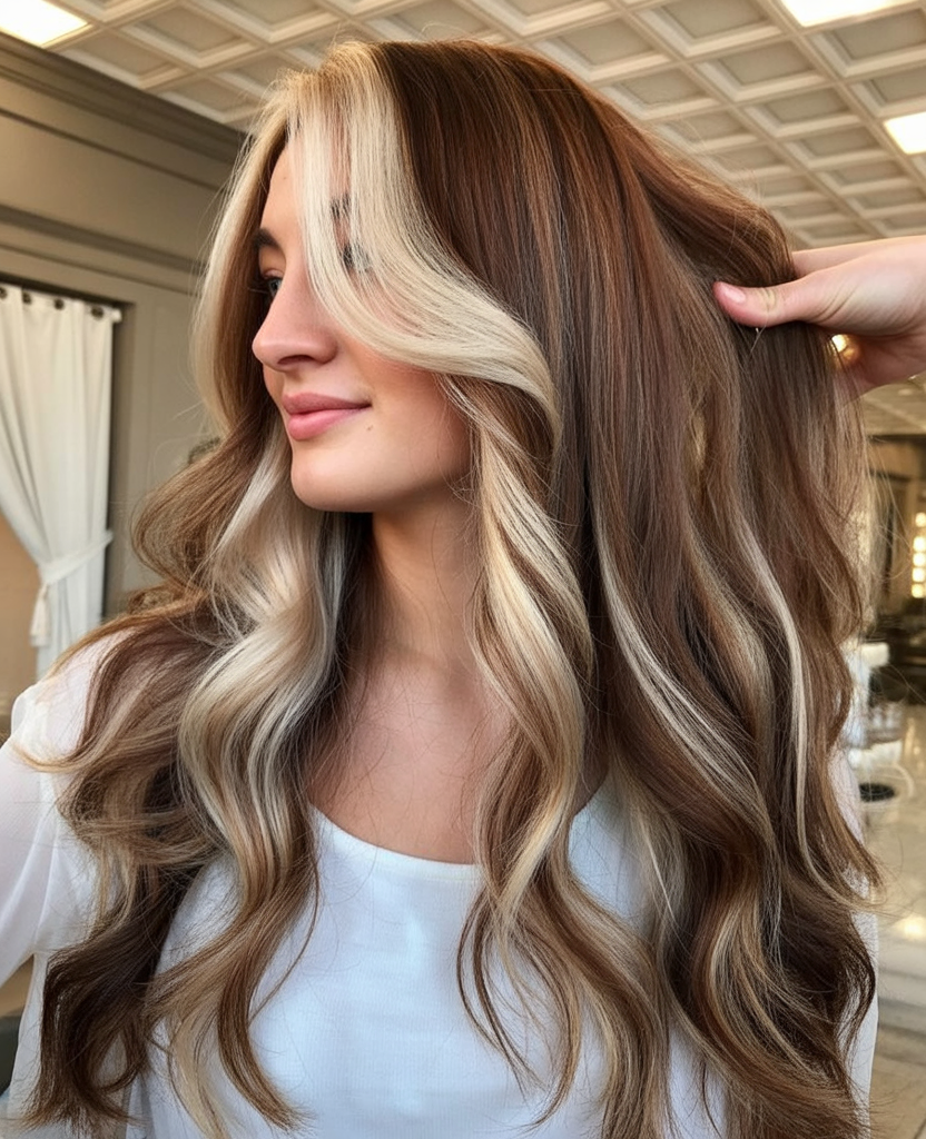 In 2025 and heading into 2026, the big trend is gentle contrast—think ribbons of blonde instead of harsh lines and a brunette base that stays rich for dimension. This balayage approach is perfect if you want something current without chasing high-maintenance color. Style with a quick bend-wave (a flat iron works great), then spritz with a flexible hairspray so the texture holds but still moves when you run your fingers through it.
