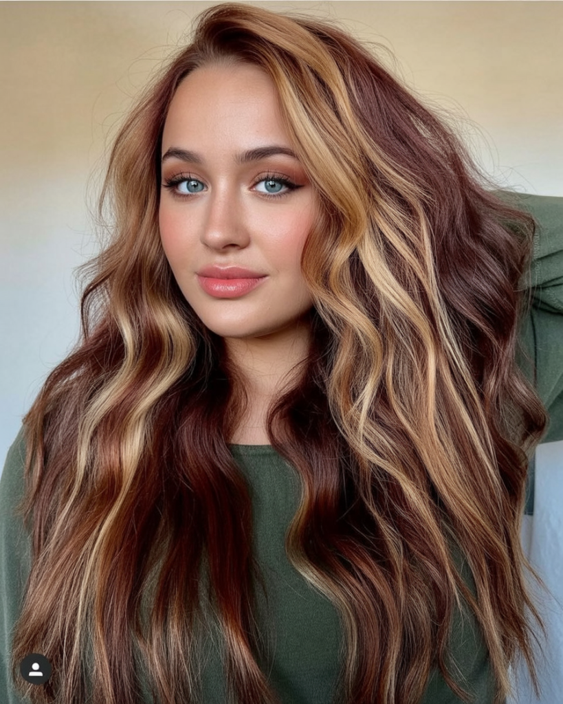 If you love warmth, this is the dream. The brunette leans red and copper, and the golden highlights feel like sunlight woven right through the waves. It’s dimensional, glossy, and honestly a little addictive—because every time the hair moves, you get that soft shimmer that makes the whole look feel more luxurious.