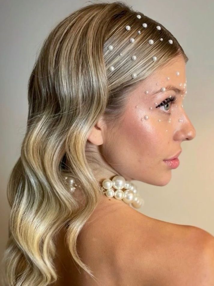 Use a wave iron to create perfect retro waves, and carefully attach pearl accessories using bobby pins. Finish with a strong-hold hairspray to ensure the pearls stay in place all night long. This look works well for medium length hair.
