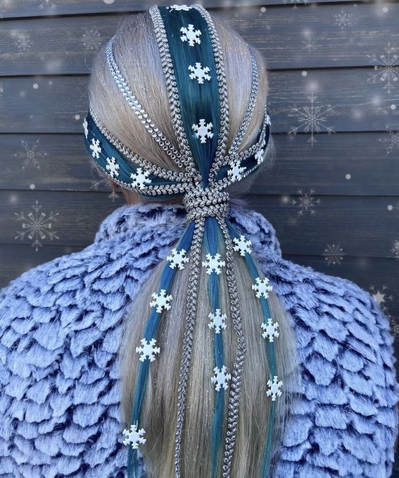 Create a tight ponytail and braid it into sections, weaving in glittery snowflakes as you go. This hairstyle is ideal for long hair and those who want a unique yet cute holiday look.