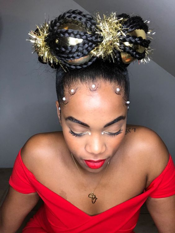 Start by braiding your hair into smaller sections before creating a large topknot bun. Weave tinsel through the braids and attach the ornaments securely. This hairstyle is ideal for black women with braids or cornrows looking for a funky and festive twist.